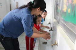 Giáo viên rửa tay hoặc hướng dẫn cho trẻ rửa tay với xà phòng đúng lúc, đúng cách để phòng chống bệnh tay chân miệng