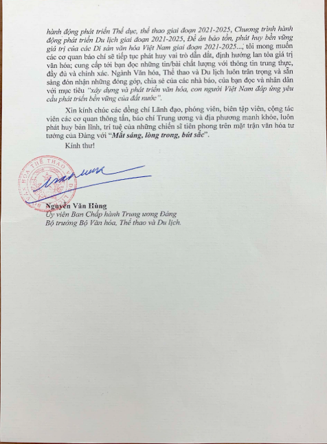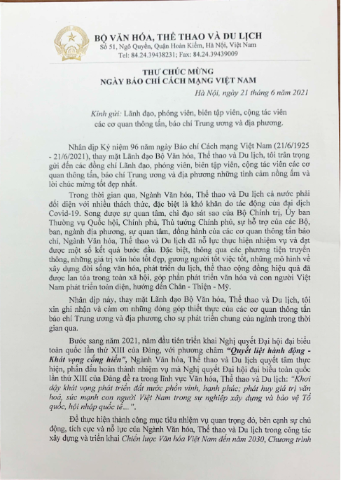 Bộ trưởng Bộ Thể thao, Văn hóa và Du lịch gửi thư Chúc mừng ngày Báo chí Cách mạng Việt Nam