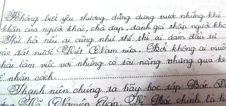 “Nhiều người cho rằng chữ viết bây giờ không quan trọng nhưng gia đình tôi luôn động viên, khuyến khích con giữ thói quen luyện chữ và đọc sách. Tôi muốn cháu rèn sự kiên nhẫn và biết yêu, biết quý cái đẹp, cái hay của tiếng Việt”, người mẹ bày tỏ.