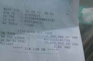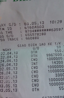 Ngày 30/4/2013 tôi có thực hiện một giao dịch lúc 8h52p và có lấy BIÊN LAIGIAO DỊCH RÚT TIỀN thể hiện nội dung như sau: ATM ID : 6700A001, SỐ G/D : 654190973, SỐ TRACE : 71890. sau đó ngày 3/5/2013 lúc 10h29p tôi có thực hiện GIAO DỊCH SAO KÊ T/K thì lại không có giao dịch ngày 30/4 nhưng những giao dịch trước và sau ngày đó lại có như sau:24.04.13 CWD 1000000.00 VND và ngày 02.05.13 CWD 1000000.00 VND.