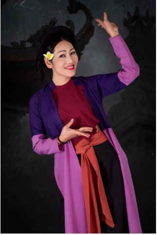 Ca sĩ Minh Thu trong hình ảnh cô ca nương ngày xưa vừa gõ phách, vừa hát ca trù.