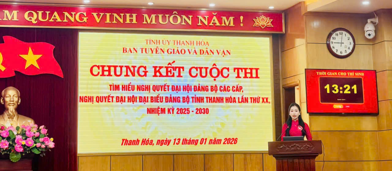 Ngày 13/1, Ban Tuyên giáo và Dân vận Tỉnh ủy Thanh Hóa tổ chức vòng chung kết Cuộc thi tìm hiểu Nghị quyết đại hội đảng bộ các cấp và Nghị quyết Đại hội đại biểu Đảng bộ tỉnh Thanh Hóa lần thứ XX, nhiệm kỳ 2025–2030. Sự kiện là điểm nhấn quan trọng trong đợt sinh hoạt chính trị sâu rộng, góp phần đưa nghị quyết của Đảng đến gần hơn với thực tiễn đời sống.
