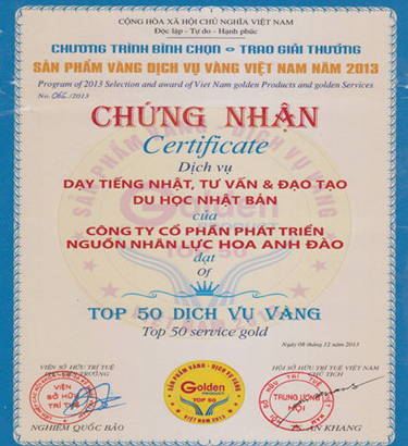 Box 1: Mới đây, 08/12/2013, Cục Sở hữu Trí tuệ phối hợp với Liên hiệp các hội KHKT Việt Nam đã chỉ đạo việc bình chọn &trao tặng GIẤY CHỨNG NHẬN Dịch vụ Vàng về Dạy tiếng Nhật; Tư vấn & Đào tạo du học Nhật Bản cho Công ty HOA ANH ĐÀO (Ảnh). Trước đó, nhân ngày Doanh nhân Việt nam 13/10/2013, nhà nước Việt nam đã tặng TS. Lê Minh Tiến – Giám đốc Công ty HOA ANH ĐÀO Cúp vàng Doanh nhân Ưu tú Đất Việt.