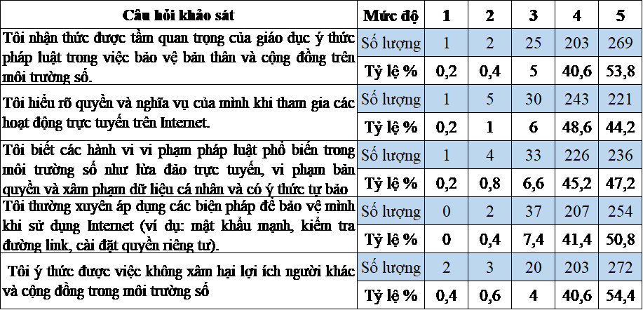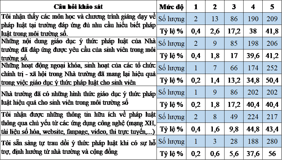 Để có kết quả thực tế về hoạt động giáo dục YTPL cho SV trong môi trường số ở TP. Hồ Chí Minh hiện nay, công trình đã thực hiện khảo sát ngẫu nhiên 500 SV ở một số trường đại học, cao đẳng ở TP. Hồ Chí Minh theo thang đo 5 mức độ: 1) Hoàn toàn không đồng ý; 2) Không đồng ý; 3) Không có ý kiến; 4) Đồng ý; 5) Hoàn toàn đồng ý. Kết quả cho thấy bức tranh thực trạng giáo dục ý thức pháp luật cho SV ở TP. Hồ Chí Minh về cơ bản như sau: