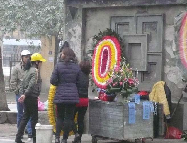 9 giờ sáng, vào vai người đi đặt vòng hoa để phúng viếng, chúng tôi đến một cửa hàng kinh doanh hoa đám tang nằm trên đường Giải Phóng, được bà chủ đon đả đón: "Với những vòng 100% hoa tươi thì giá đắt hơn nhiều so với những vòng hoa xen lẫn cả hoa giả, hoa thật và những chiếc vòng hoa bình dân kia...". Vừa nói, bà vừa chỉ tay vào vòng hoa xếp quanh đó. Khi chúng tôi thắc mắc về phụ kiện - cái còn nguyên ghim, cái đã bong, rồi cái thì lấm bùn đất lem nhem... chị Hoa - một nhân viên của cửa hàng - thủng thẳng cho biết, đó là hàng vừa gỡ ra chuẩn bị làm sạch và cắm lại.