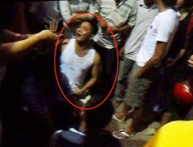 Người dân vây bắt một đối tượng (vòng đỏ) trong nhóm hành hung tài xế, cướp taxi.