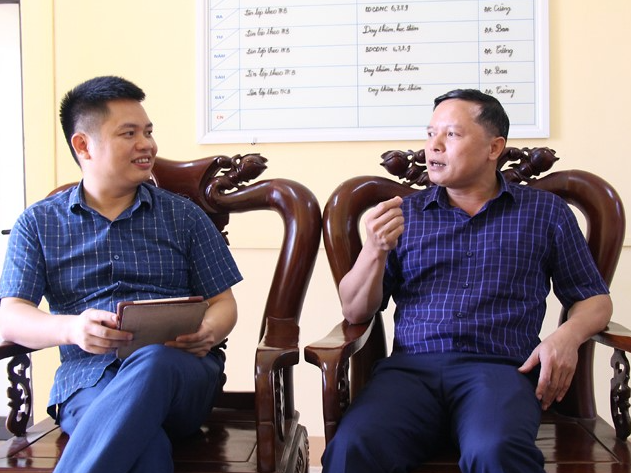 Nhà báo Đình Thơm (bên trái) chia sẻ với Thầy giáo Trường THCS Lê Quý Đôn huyện Thanh Sơn, tỉnh Phú Thọ