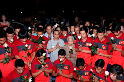Ngay khi vừa xuống xe, Trưởng đoàn, ông Dương Nghiệp Khôi, chia cho các cầu thủ các bông hoa hồng trắng được chuẩn bị sẵn cho lễ viếng và nhắc nhở các cầu thủ xếp hàng một.