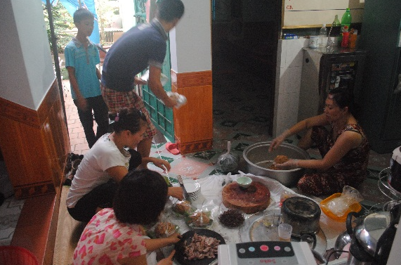 Bà Đinh Thị Hồng (vợ ông Khoan, bên phải) cùng với phụ huynh HS chuẩn bị bữa ăn cho thí sinh.