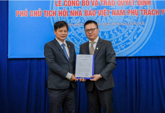 Ông Lê Quốc Minh trao quyết định phân công ông Trần Trọng Dũng làm Phó Chủ tịch Hội Nhà báo Việt Nam phụ trách phía Nam