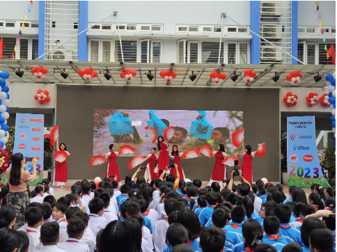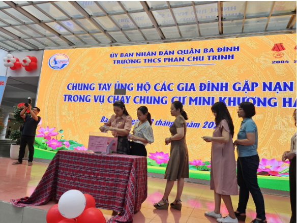 Mở đầu buổi lễ, tất cả các vị đại biểu, các thầy cô giáo, các vị phụ huynh và các em học sinh đã dành một phút mặc niệm để tưởng nhớ 56 nạn nhân đã mất trong vụ hỏa hoạn xảy ra đêm 12/9/2023 tại phố Khương Hạ, phường Khương Đình, quận Thanh Xuân, TP Hà Nội.