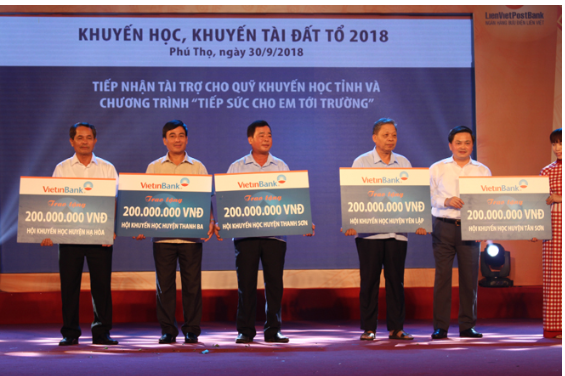 Ngân hàng Techcombank và viettinbank đã ủng hộ 2 tỷ đồng cho Quỹ Khuyến học của 10 huyện: Hạ Hòa, Thanh Ba, Thanh Sơn, Yên Lập, Tân Sơn, Đoan Hùng, Thanh Thủy, Lâm Thao, Phù Ninh, Tam Nông (mỗi huyện 200 triệu đồng/đơn vị tài trợ). Chi nhánh VIETTEL đã trao tặng 4.810 triệu đồng cho Quỹ Khuyến học tỉnh, 15 đơn vị đồng hành cùng Hội Khuyến học tỉnh trong chương trình “Tiếp sức cho em đến trường”, “Vì em hiếu học” với tổng số tiền gần 2,8 tỷ đồng.