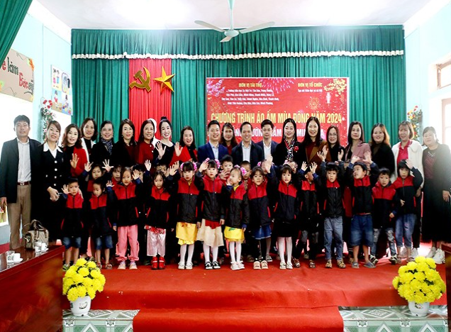 Các đại biểu và các đơn vị tài trợ trao áo ấm mùa đông cho các em học sinh Trường Mầm non Minh Hòa