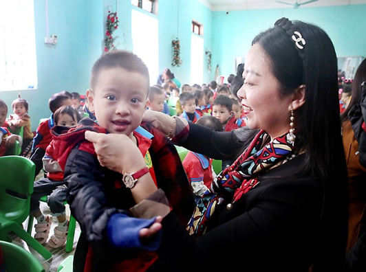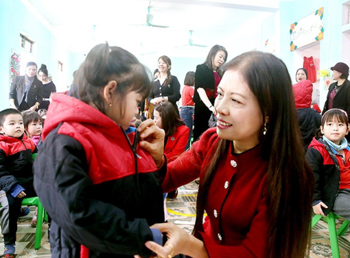 Cô giáo Bùi Thị Tuyết Mai, Phó Hiệu trưởng Trường Tiểu học Gia Cẩm tặng áo khoác cho các em học sinh Trường Mầm non Minh Hòa
