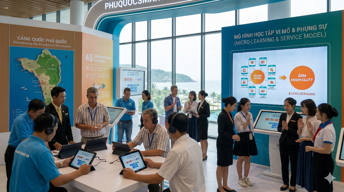 Điểm nổi bật của công trình nằm ở sự tích hợp công nghệ số thông qua hệ sinh thái phuquocsmart.vn và phuquocsmart.net cùng hệ thống audio bản ngữ đa ngôn ngữ và các tính năng học tập tiên tiến như shadowing, điều chỉnh tốc độ và học ngoại tuyến. Nhờ đó, cuốn sách đã vượt qua những giới hạn cố hữu của sách in truyền thống để trở thành một nền tảng học tập linh hoạt, có khả năng cập nhật liên tục và dễ dàng tiếp cận đối với đông đảo người lao động trong ngành dịch vụ tại Phú Quốc. Trong bối cảnh đặc thù của “Đảo Ngọc”, nơi lực lượng lao động đa dạng về trình độ và điều kiện tiếp cận giáo dục, mô hình này đặc biệt có ý nghĩa trong việc thu hẹp khoảng cách kỹ năng và nâng cao năng lực giao tiếp thực hành.