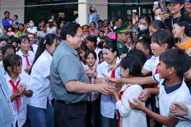 Các em học sinh và người dân xã miền núi Bát Mọt chào đón Thủ tướng Phạm Minh Chính tới dự khởi công Trường nội trú liên cấp Tiểu học và Trung học cơ sở Bát Mọt chiều ngày 14/10