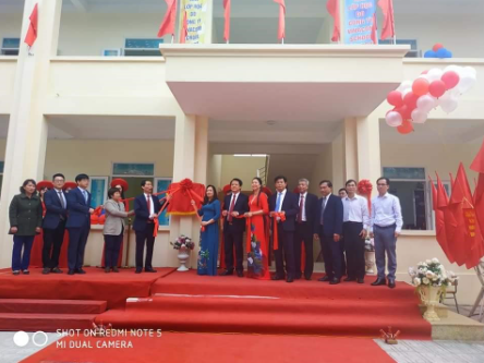 Lãnh đạo Sở GD&ĐT cũng Lãnh đạo thành phố và Công ty cắt băng khánh thành.