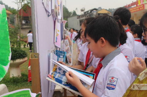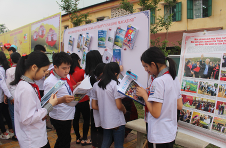 Các em học sinh đang tìm hiểu thêm các tài liệu tham khảo môn Tiếng Anh tại buổi ngoại khóa