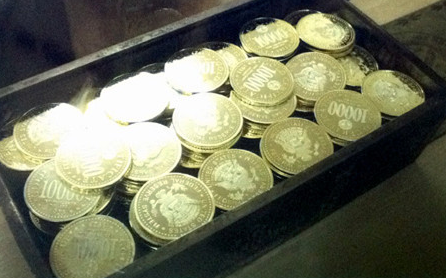 Đây là những đồng xu hợp kim màu vàng sẫm hình tròn, in mệnh giá 10.000 USD, ghi sản xuất năm 1923, được đóng thành các thùng, mỗi thùng có 360 xu, tổng trị giá 72 tỷ USD.