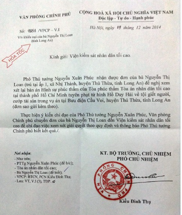 Công văn ghi rõ: “Phó Thủ tướng Nguyễn Xuân Phúc nhận được đơn của bà Nguyễn Thị L (SN 1963, ấp 1, xã Nhị Thành, Thủ Thừa, Long An) đề nghị xem xét lại bản án hình sự phúc thẩm của Tòa Phúc thẩm Tòa án Nhân dân tối cao tại Thành phố Hồ Chí Minh tuyên phạt tử hình Hồ Duy Hải về tội giết người, cướp tài sản trong vụ án tại Bưu điện Cầu Voi (huyện Thủ Thừa, tỉnh Long An).
