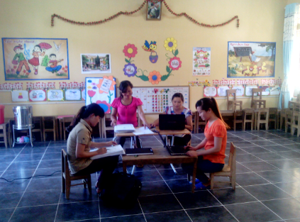 Cô giáo Trường Mầm non Mông Sơn đang kiểm tra lập danh sách các em học sinh được hưởng hỗ trợ chi phí học tập và ăn trưa theo quy định của Chính phủ .