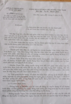 Trong công văn số 1800/UBND – NC của Ủy ban nhân dân tỉnh Yên Bái ghi rõ: Nhằm đáp ứng nhu cầu đội ngũ giáo viên thực hiện nhiệm vụ năm học 2016 – 2017 tại các cơ sở giáo dục và đào tạo trên địa bàn tỉnh Yên Bái; UBND tỉnh Yên Bái Yêu cầu các huyện thị xã, thành phố thực hiện các nhiệm vụ, tiếp tục tổ chức thực hiện việc tuyển dụng giáo viên mầm non trên địa bàn như: thành phố Yên Bái, thị xã Nghĩa Lộ và các huyện: Văn Chấn, Văn Yên , Yên Bình, Lục Yên, Mù Căng Chải tiếp tục thực hiện các quy trình tuyển dụng giáo viên mầm non theo cơ cấu số lượng và hình thức tuyển dụng đã được Ủy ban nhân dân tỉnh phê duyệt ngày 18/3/2016.